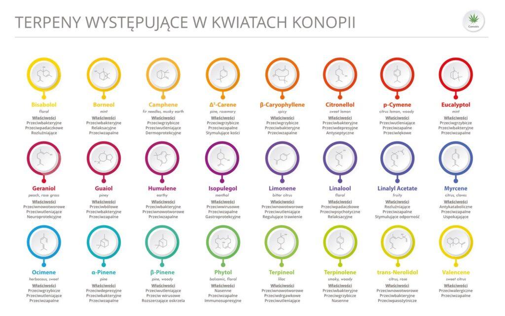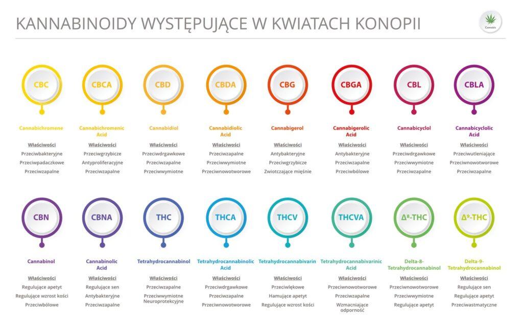 2. CBG (kannabigerol) powstaje bezpośrednio z CBGA w procesie dekarboksylacji. Uważany za kannabinoid przyszłości. CBG jest antagonistą receptora CB1, również nie posiada działania psychoaktywnego, wykazuje działanie przeciwzapalne i przeciwbólowe. Poprawia pracę układu pokarmowego, wpływa na procesy metaboliczne, zwiększa wrażliwość na insulinę, wpływa na obniżenie poziomu cholesterolu i obniżenie ciśnienia krwi. Trwają badania nad wykorzystaniem CBG w leczeniu chorób nowotworowych. CBG prawdopodobnie wpływa na proces neurogenezy.